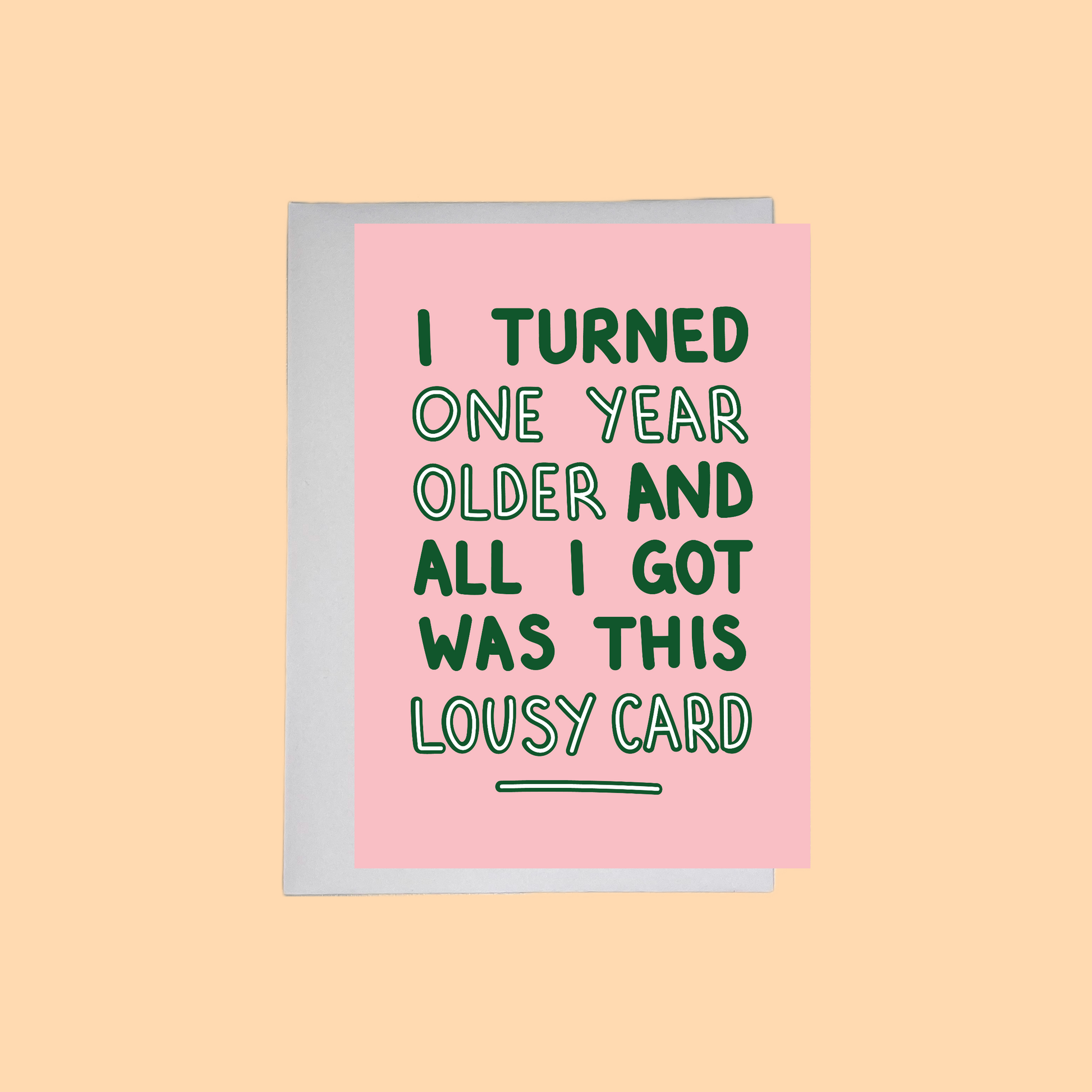 Embrace Humorous Honesty with our "Lousy Card" A6 Greeting Card! Tired of the same old birthday clichés? Step into a world of refreshingly honest humor with our A6 greeting card that speaks the truth: "I turned one year older and all I got was this lousy card." Set against a charming pink background with vibrant green writing, this card is the perfect blend of cheeky and charming.