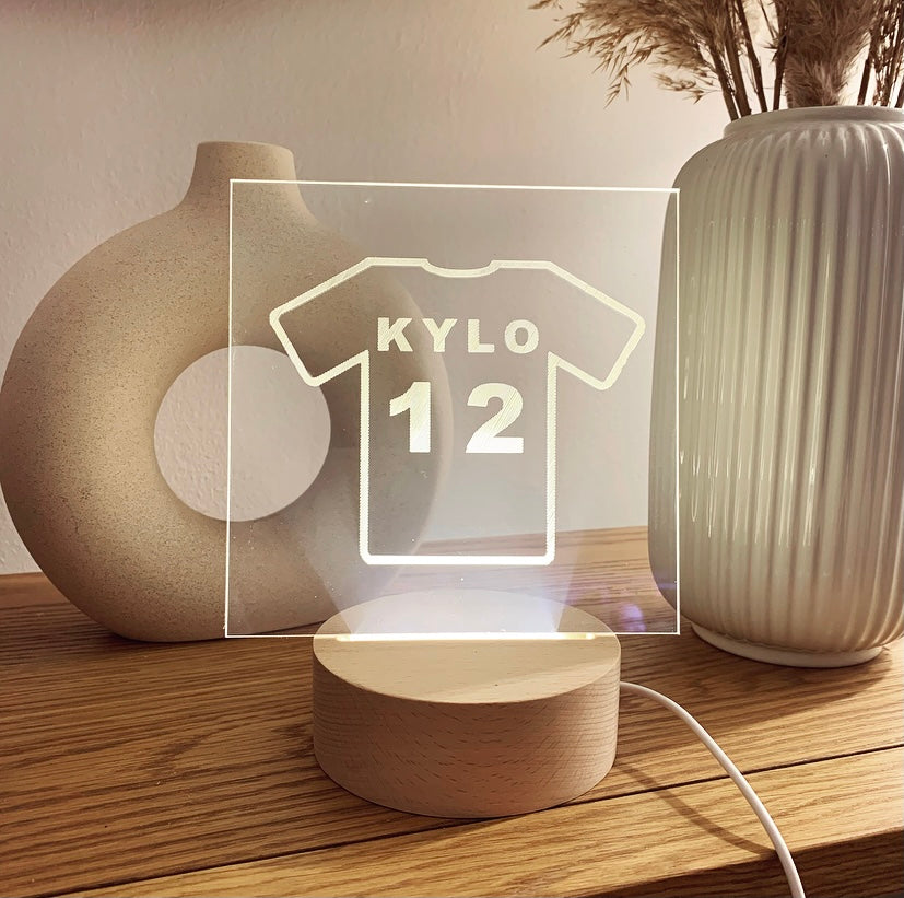 Make bedtime extra special with this fun and personalised football night light! A warm white light shines through the wooden base and engraved acrylic top, with 5 LED beads to create a calming atmosphere in your child's bedroom. Create a lightbox with a personalised football shirt to match their style and show off at night. The perfect addition to any football fan's bedroom.