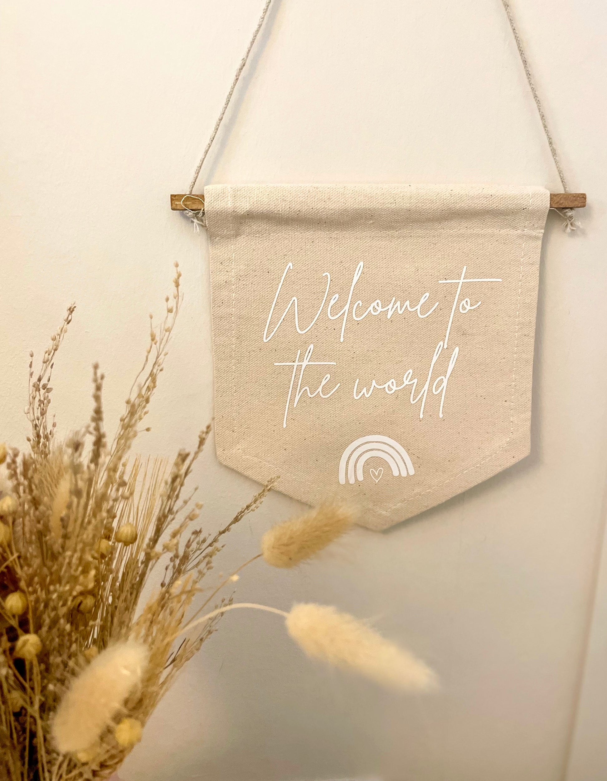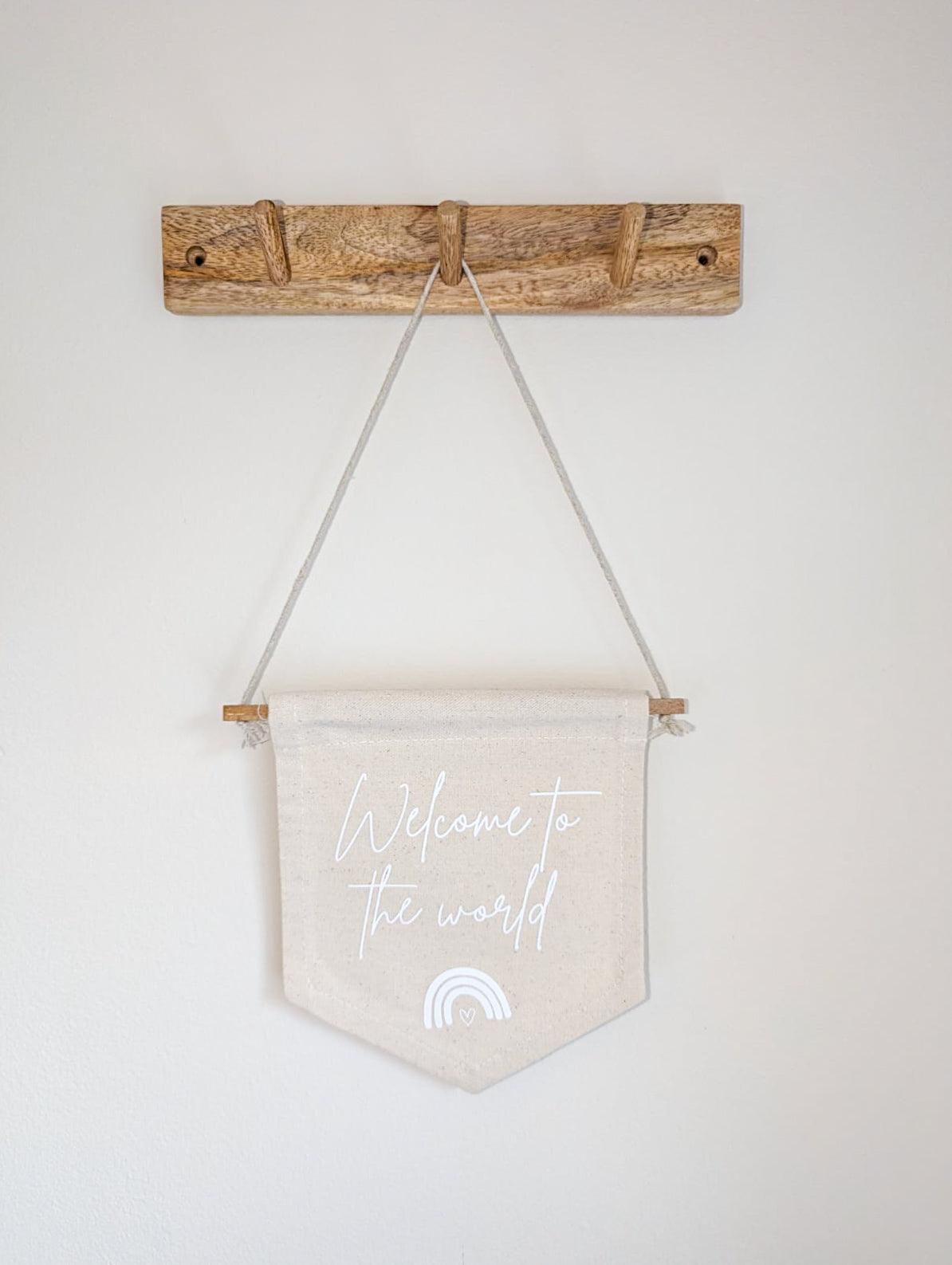 'Welcome to the World' Wall Hanging Flag | Canvas Banner | Nursery Accessories | Nursery Banner | Neutral Nursery | Nursery Wall Art | Boho Nursery | Newborn